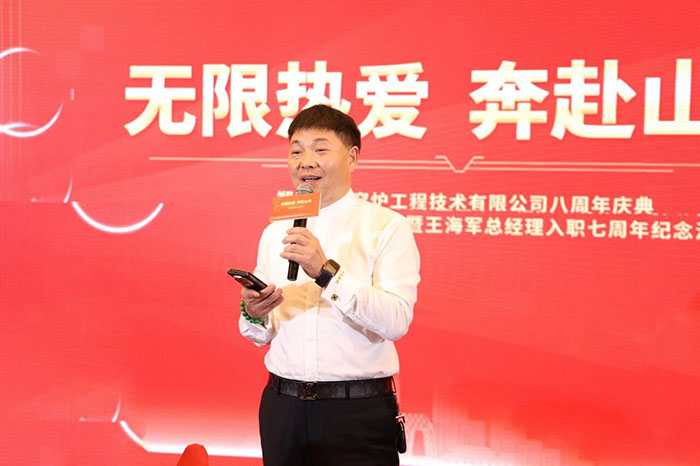 集團(tuán)董事長楚科奇首先發(fā)表了致辭。他回顧了榮盛窯爐工程八年來從創(chuàng)業(yè)維艱到行業(yè)頭部的奮斗歷程。他指出,每一份成績的取得,都凝聚著全體員工的智慧、汗水與“無限熱愛”。楚總向入職七周年的王海軍總經(jīng)理表達(dá)敬意與感謝,高度評價,擁有 領(lǐng)導(dǎo)力和市場洞察力。他特別強(qiáng)調(diào),在王總的帶領(lǐng)下,工程公司今年業(yè)績超越預(yù)期,創(chuàng)下歷史新高,為公司樹立了新的發(fā)展標(biāo)桿。同時,楚總也對朱廣州帶領(lǐng)的工程項目部、白建偉負(fù)責(zé)的生產(chǎn)部以及集團(tuán)管理層表達(dá)了充分肯定,感謝各團(tuán)隊為公司發(fā)展作出的重要貢獻(xiàn)。后,楚總號召全體榮盛人,以八周年為新的起跑線,憑借對事業(yè)的無限熱愛與堅定信念,共同驅(qū)動榮盛巨輪,在時代的浪潮中破浪前行,開辟更加壯麗的征途。